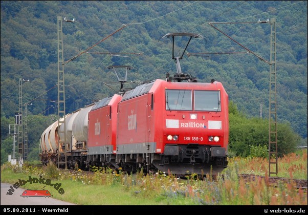 ![]() 9180 6 185 164-1 am 05.08.2011 in Wernfeld Bild: Verkehrsrot |