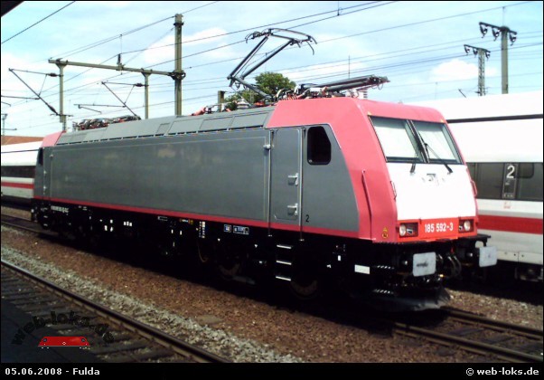 ![]() 185 592-3 am 17.07.2008 in Ruhland Bild: Ohne Logos |